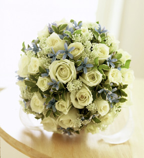 ブルースターを挿し色にしたラウンドブーケ。サムシングブルーのおまじないをブーケに込めて。。