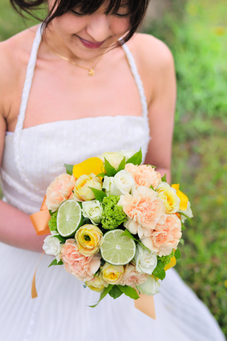 フルーツの香りが、ほのかに香る。ライム・オレンジを使った異色のブーケ。ゲストからの注目まちがいなし!