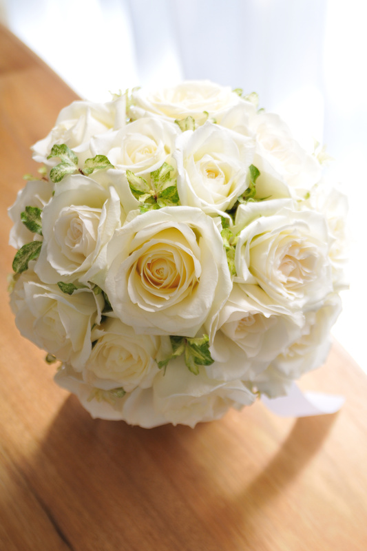 白バラをギュット詰め込んだシンプルなラウンドブーケ。