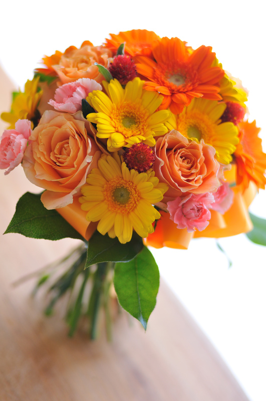 千日紅と黄色のガーベラを挿し色に加えた華やかなブーケ!