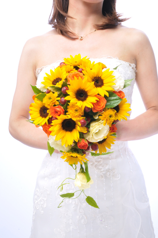 夏の風物詩ひまわりをメインにオーバル型に仕上げたブーケです。黄色やオレンジ色ドレスに最適です。