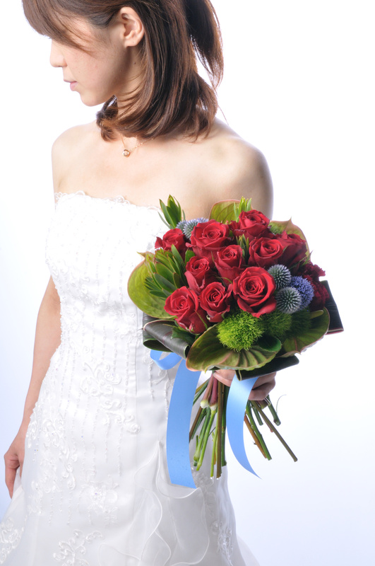 赤いバラやアンスリュームなどをまとめた個性的なブーケ。