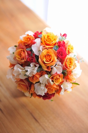オレンジのバラにひらひらかわいいスイートピーを入れて♪