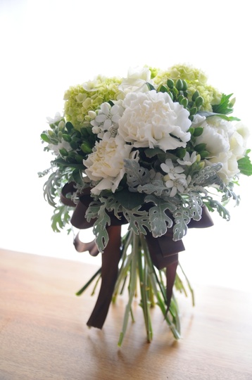 白とグリーンのナチュラルな色合わせのクラッチブーケ
