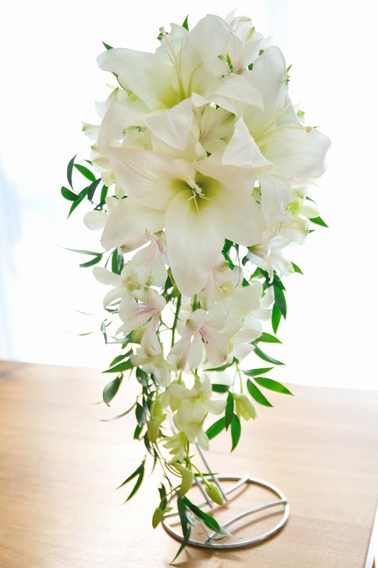 カサブランカ(ブーケデリバリーではカサブランカはシルクフラワーでのご用意)を使ったキャスケードブーケ。その他のお花やグリーンは生花でおまかせになっていますが、大変お値打ちのあるブーケで花次郎で1番人気です♪