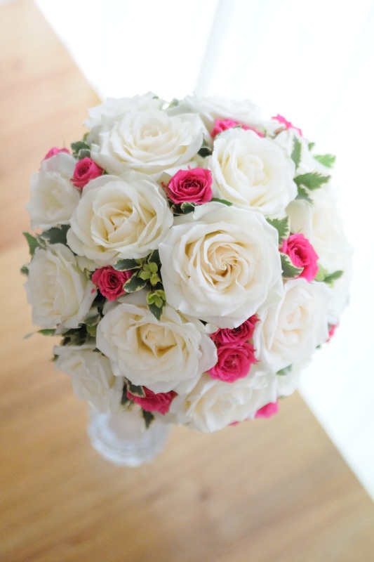チョイスブーケ 白バララウンド トッピング:ミニバラ濃いピンク