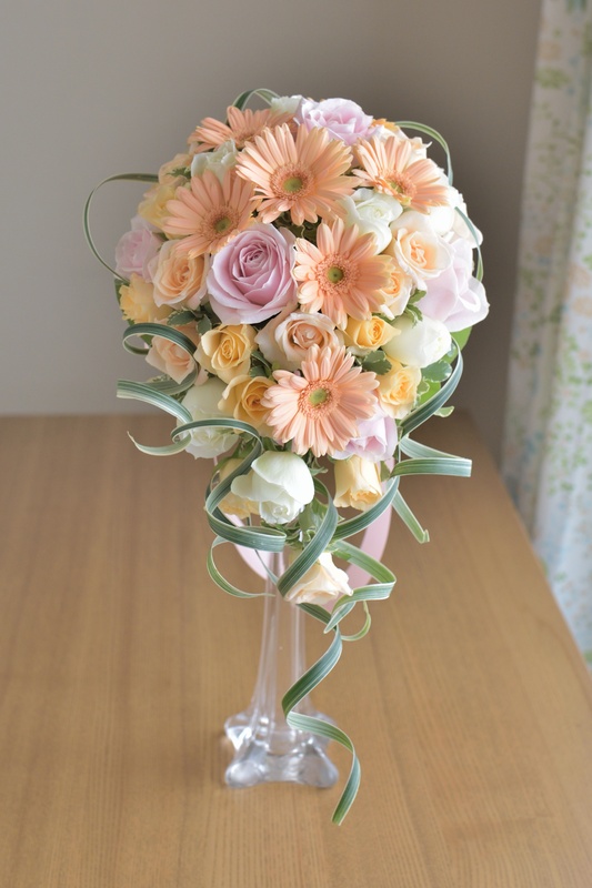 可愛い淡いオレンジのガーベラをメインに、パステルの色合いで仕上げたロングブーケです。
