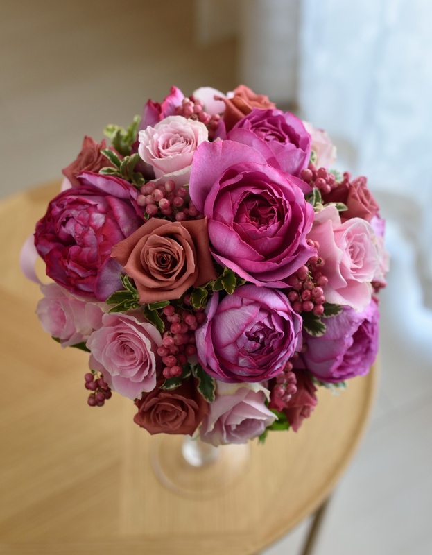 茶バラと濃いピンクのなんとも大人な組み合わせ。斬新ですが、秋らしく素敵な配色です!可愛いドレスにも意外と好相性なんですよ。