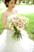 淡いピンクとアプリコットのお色がポイント。ナチュラル感満載のクラッチブーケです。
