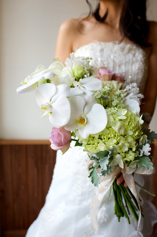 凛とした胡蝶蘭のアームブーケ☆とても優美ですが、アームでおつくりしていますので、ナチュラルにお持ち頂けます。ガーデン挙式や和装、もちろんホテル挙式にもおすすめです!