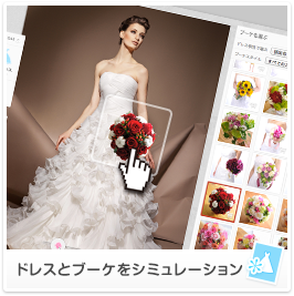 当サイトの商品ページではドレス写真と各種ブーケを着せ替えシミュレーションすることで、よりマッチしたブーケを選ぶことができます。「コーディネート」ボタンをクリックしてシミュレーション画面へ移ります。