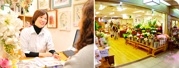 ゆったりとしたカウンターで、実際にお花をご覧頂きながら、お話しさせていただいております。フラワーショップならではの色合わせや組合わせを、ドレスとの相性をもとにご提案いたします!JR「北新地」駅からすぐ。皆様のご来店を心よりお待ちしております。