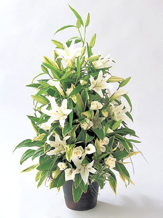 Flower/白いユリやグリーンを使って、爽やかに仕上げたアレンジメントです。